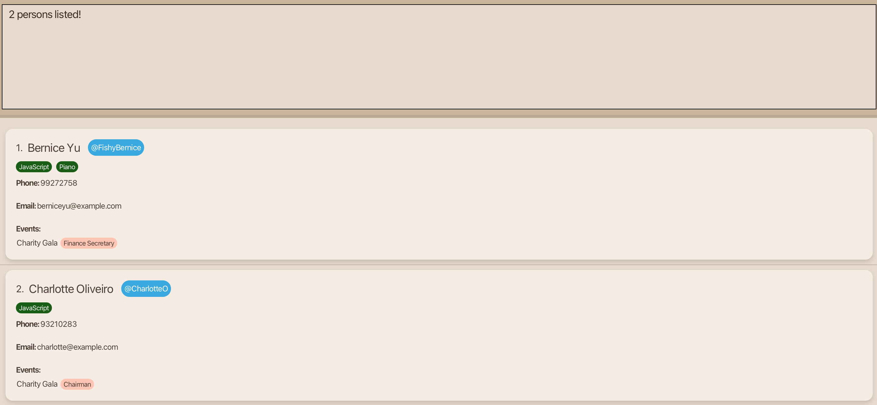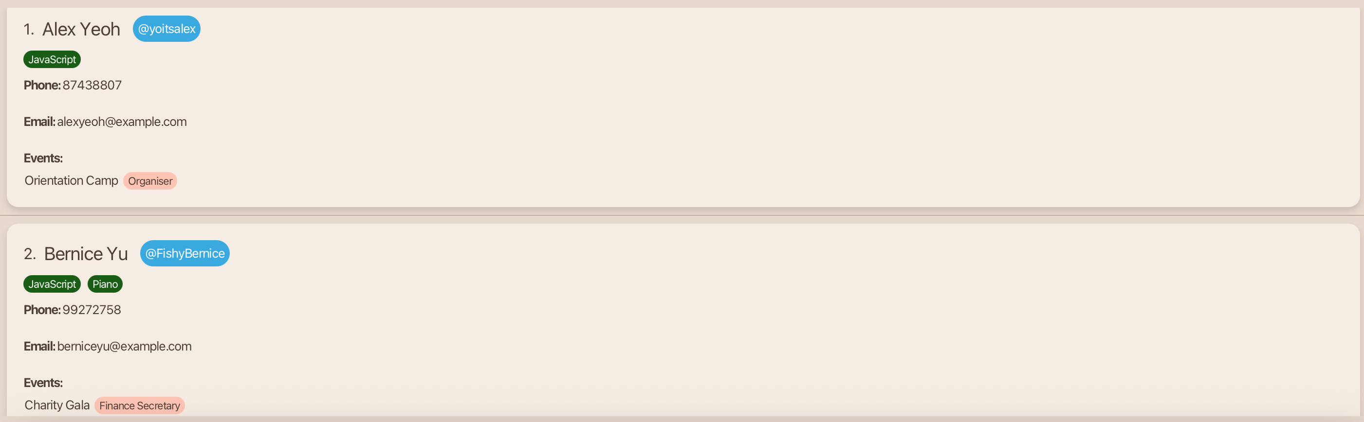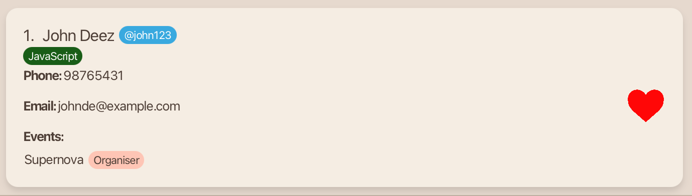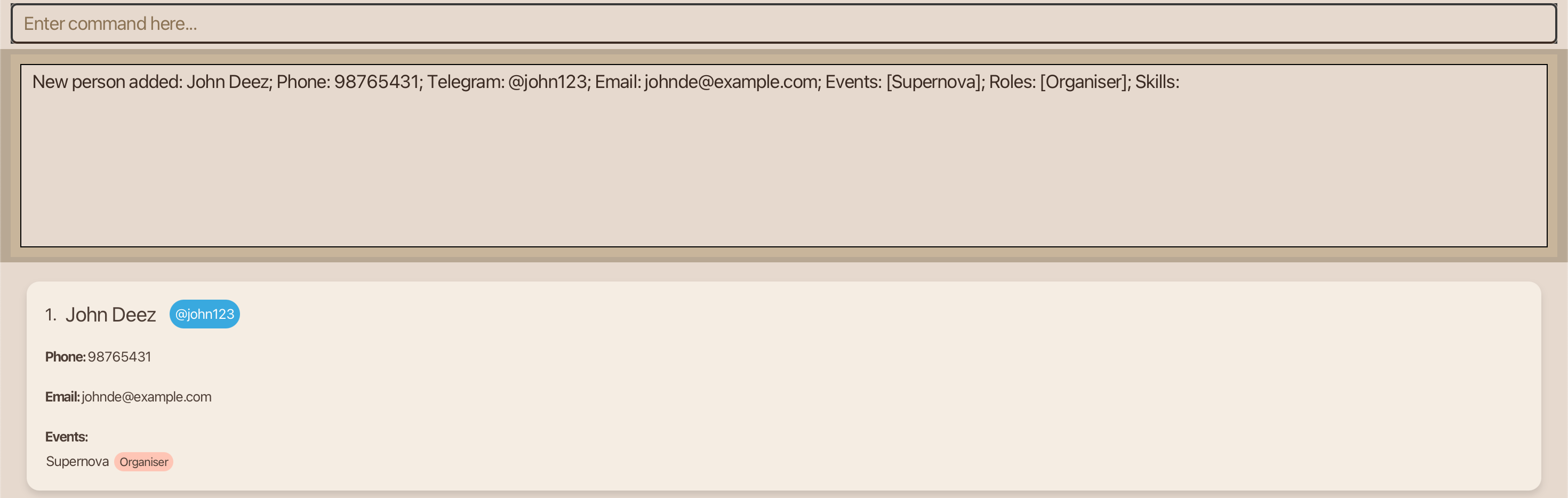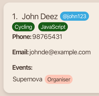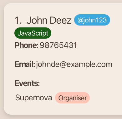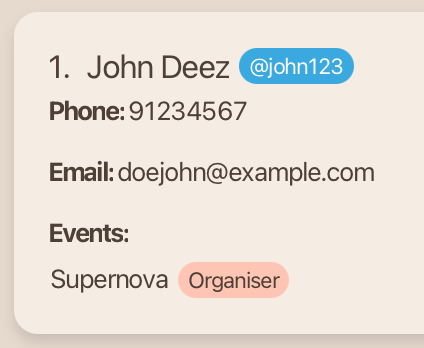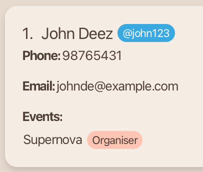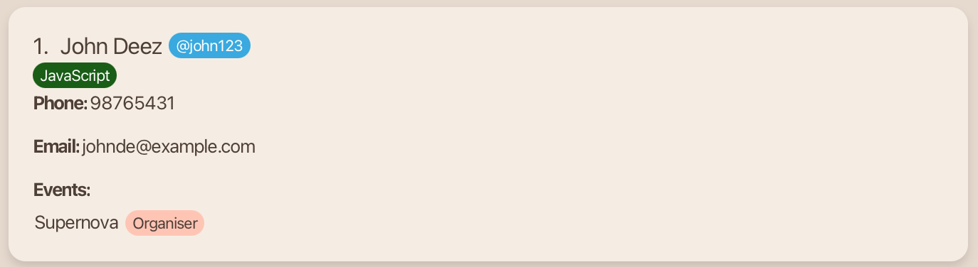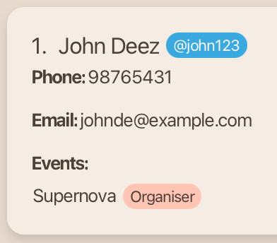 John Deez; Phone: 91234567; Telegram: @john123; Email: johndoe@example.com; Role: Organiser; Event: Supernova; Skills:,