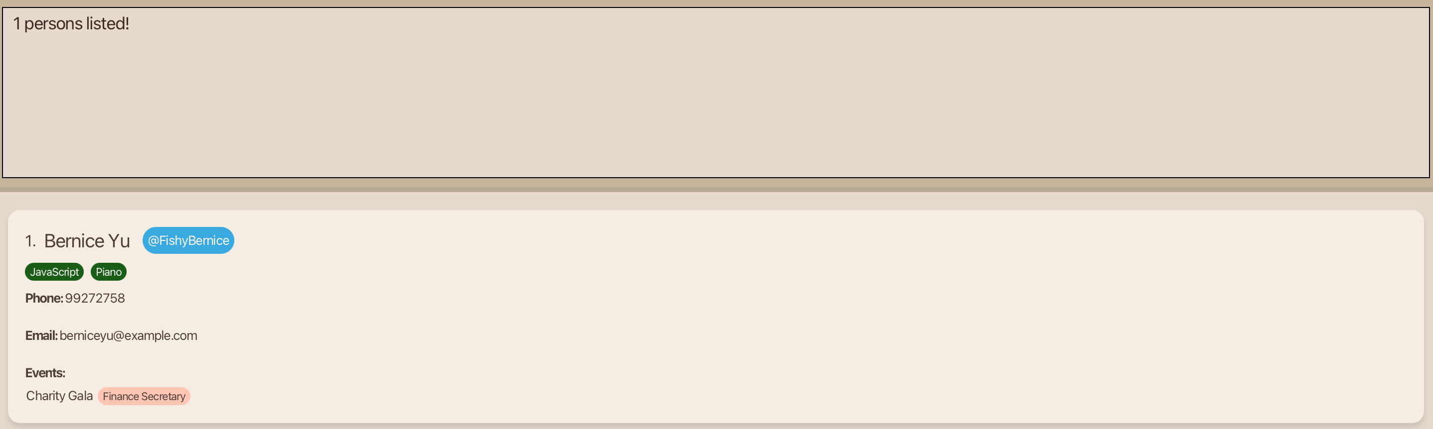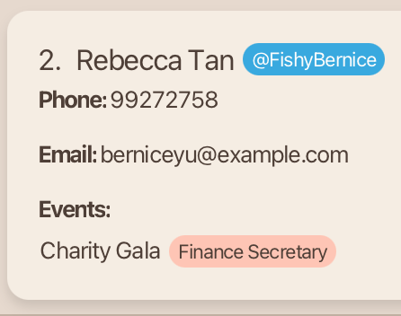 Edited Person: Rebecca Tan; Phone: 99272758; Telegram: @FishyBernice; Email: berniceyu@example.com; Events: [Charity Gala]; Roles: [Finance Secretary]; Skills: