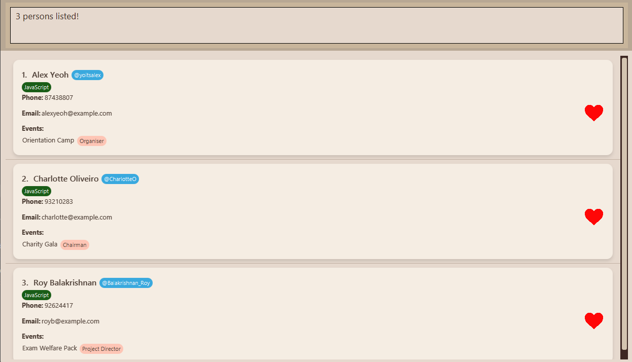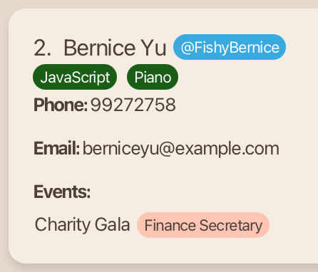 | Add: Add a contact | add n/NAME p/PHONE e/EMAIL t/TELEGRAM ev/EVENT… r/ROLE… [sk/SKILL]… or a n/NAME p/PHONE e/EMAIL t/TELEGRAM ev/EVENT… r/ROLE… [sk/SKILL]… e.g. add n/John Deez p/98765431 e/johnde@example.com t/john123 ev/Supernova r/Organiser or a n/John Deez p/98765431 e/johnde@example.com t/john123 ev/Supernova r/Organiser |
